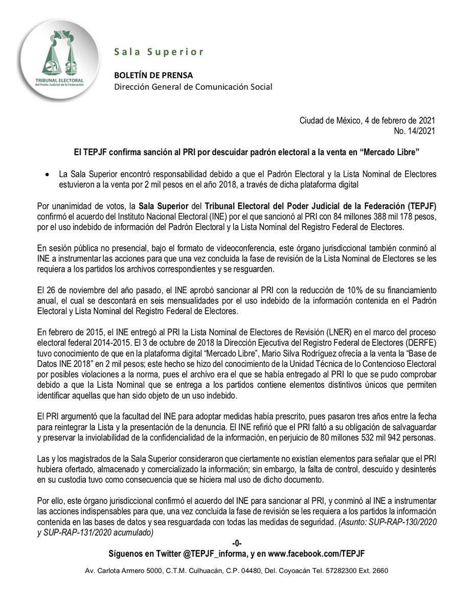 El partido revolucionario institucional (pri) fue sancionado por el tribunal electoral del poder judicial de la federación (tepjf) con una multa de 84 millones 388 mil 178 pesos, por el uso indebido del padrón electoral y la lista nominal del registro federal de electores que fueron ofertados por 2 mil pesos a través de mercado libre, en 2018.